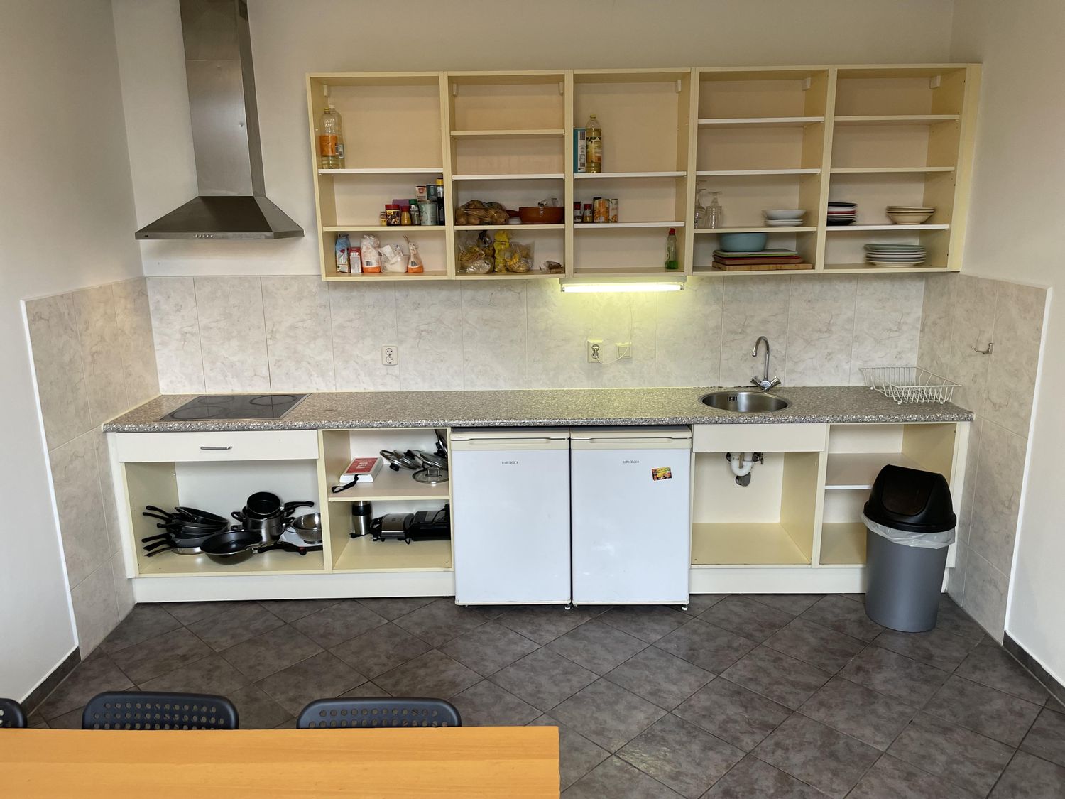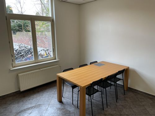 Woonkeuken gedeeld met 6 medebewoners, twee gemeenschappelijke badkamers met elk twee douches, twee gemeenschappelijke toiletten, buitenruimte en fietsenstalling.