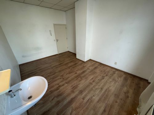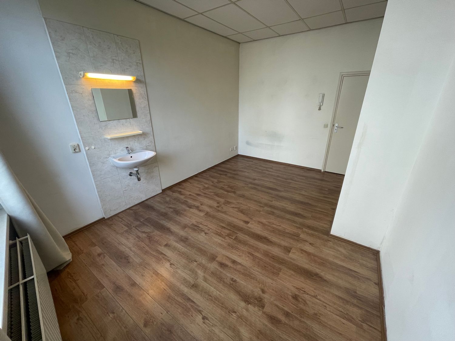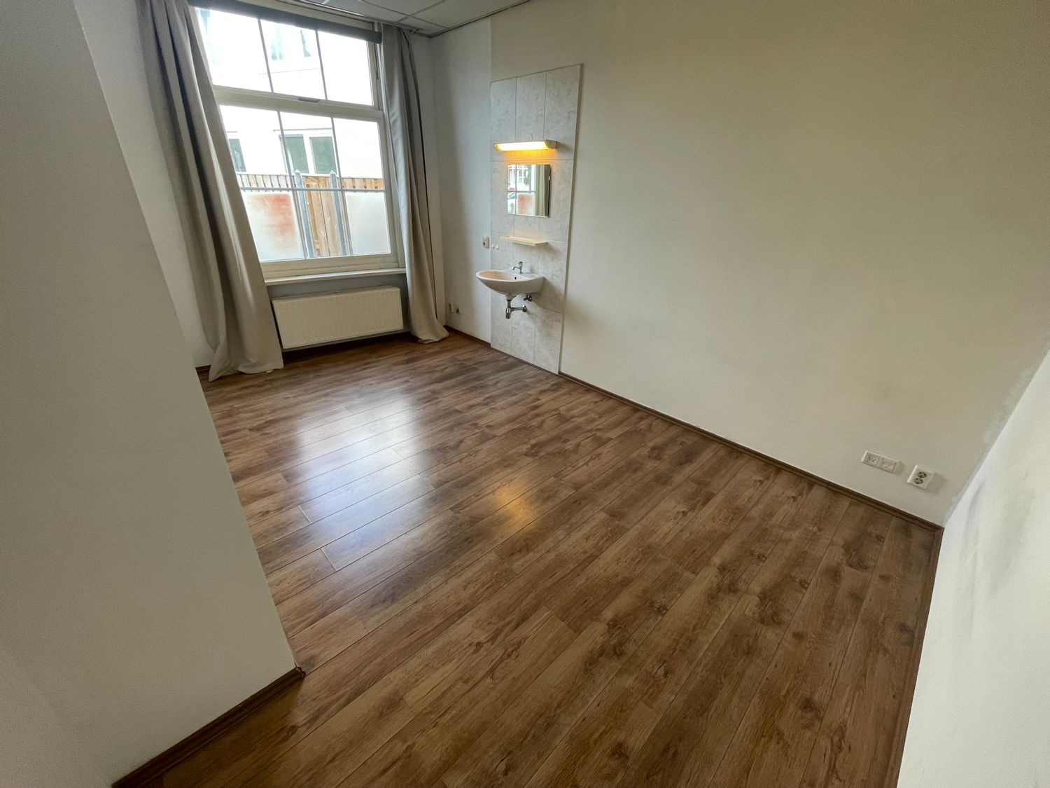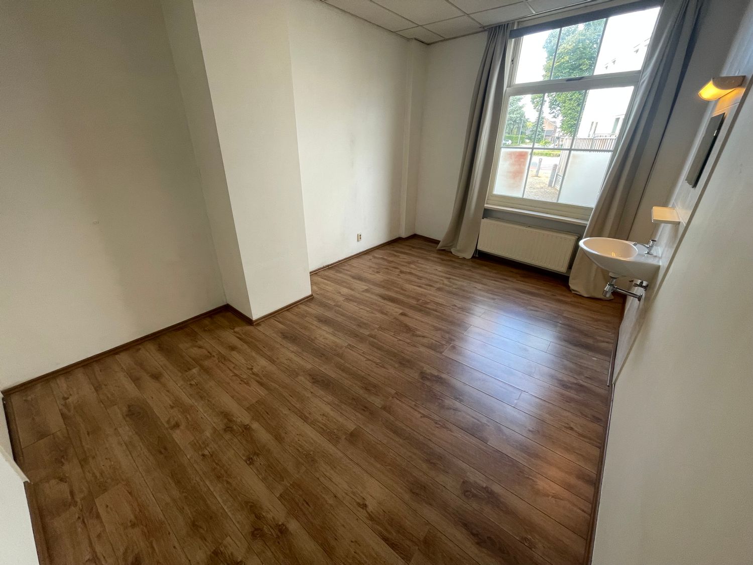 Kamer voorzien van vaste wastafel, laminaatvloer en gordijnen.